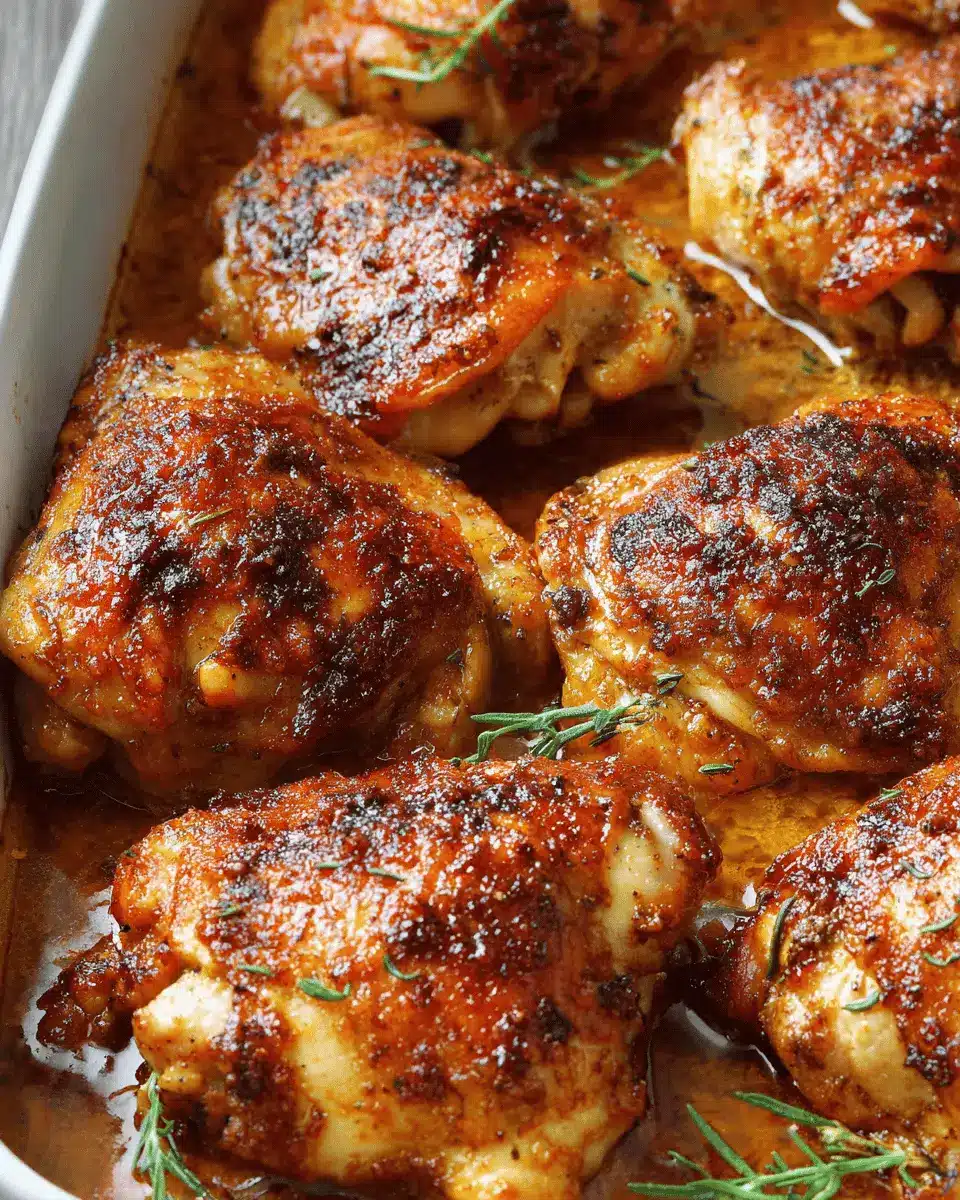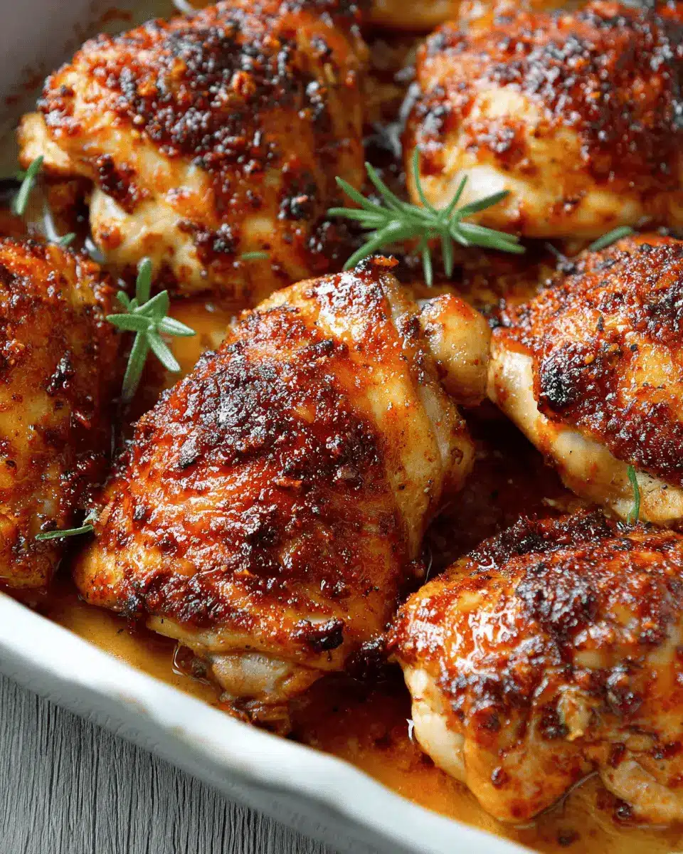 Next up, it’s time to arrange your seasoned chicken thighs. Use a rimmed baking dish, like a 9 x 13-inch pan, and lay the thighs in a single layer. This helps them cook evenly. Any leftover spice mixture? Brush that on top for extra flavor! It’s all about maximizing that taste.