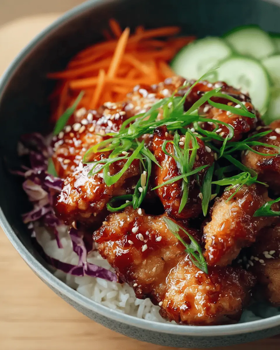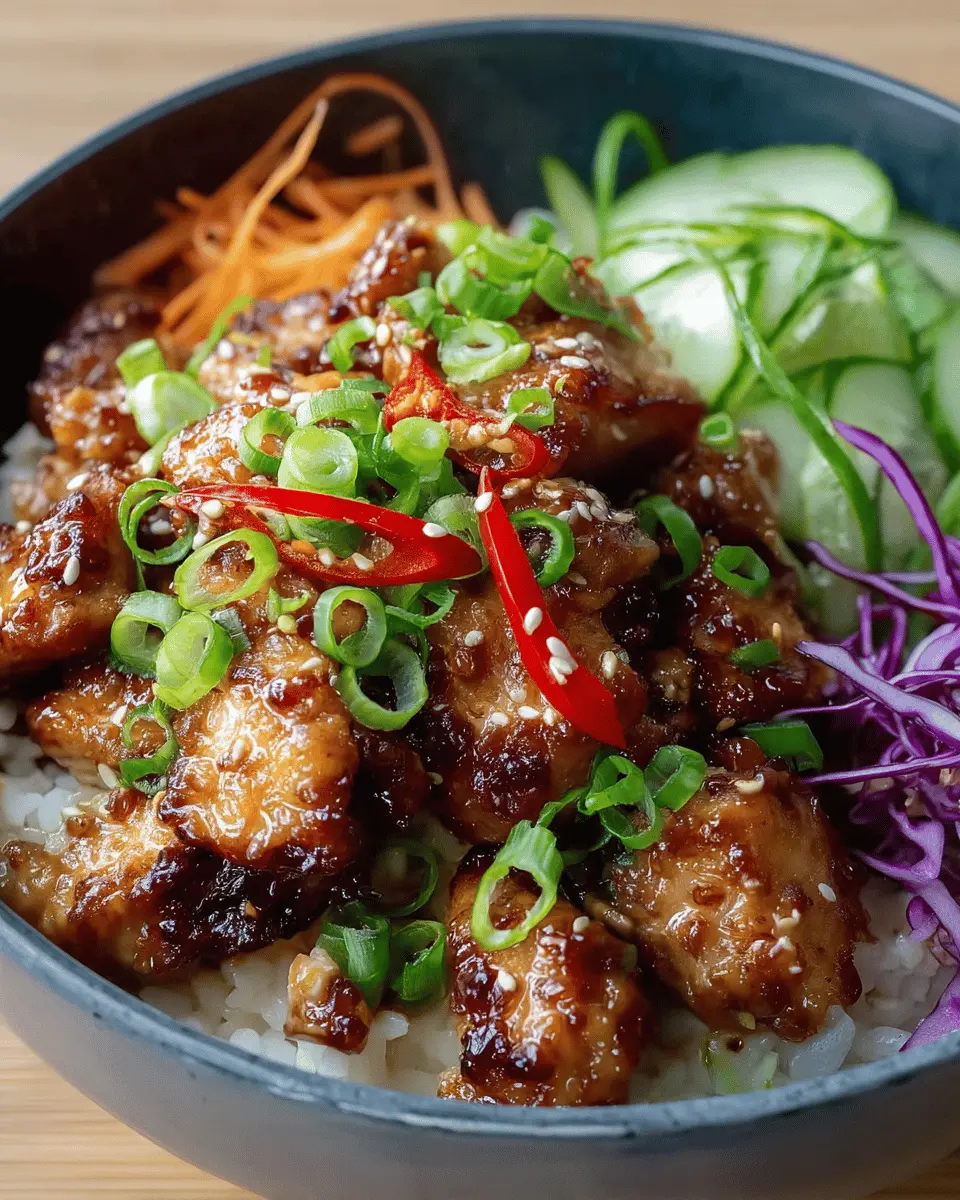 Once your chicken is out of the oven and ready to shine, it’s time to plate up! Serve the chicken alongside steamed rice, shredded red cabbage, grated or julienned carrots, and freshly sliced cucumber. Drizzle the remaining Bang Bang Sauce on top and sprinkle with sliced spring onions for an added crunch and flavor contrast. It’s not just a meal; it’s a flavor adventure!