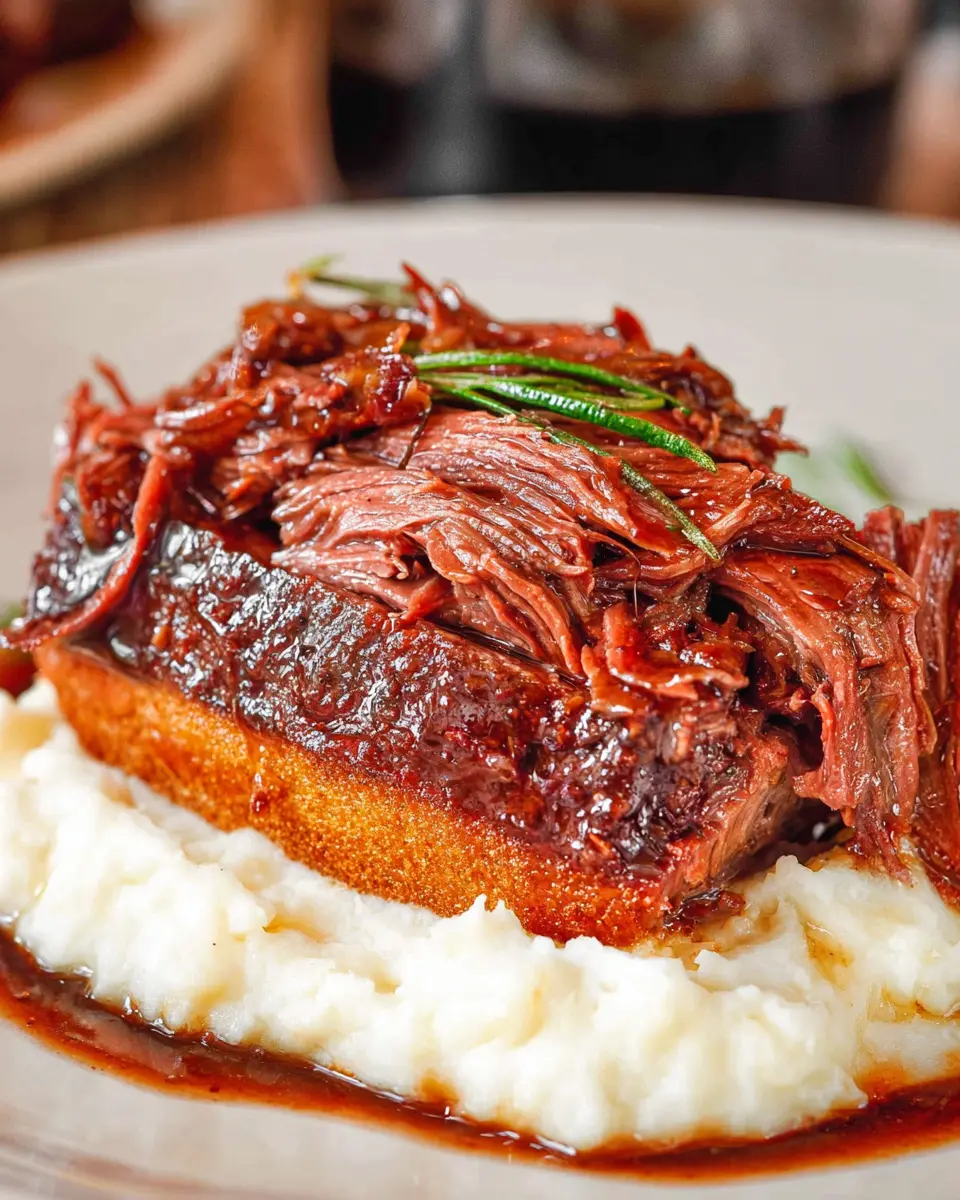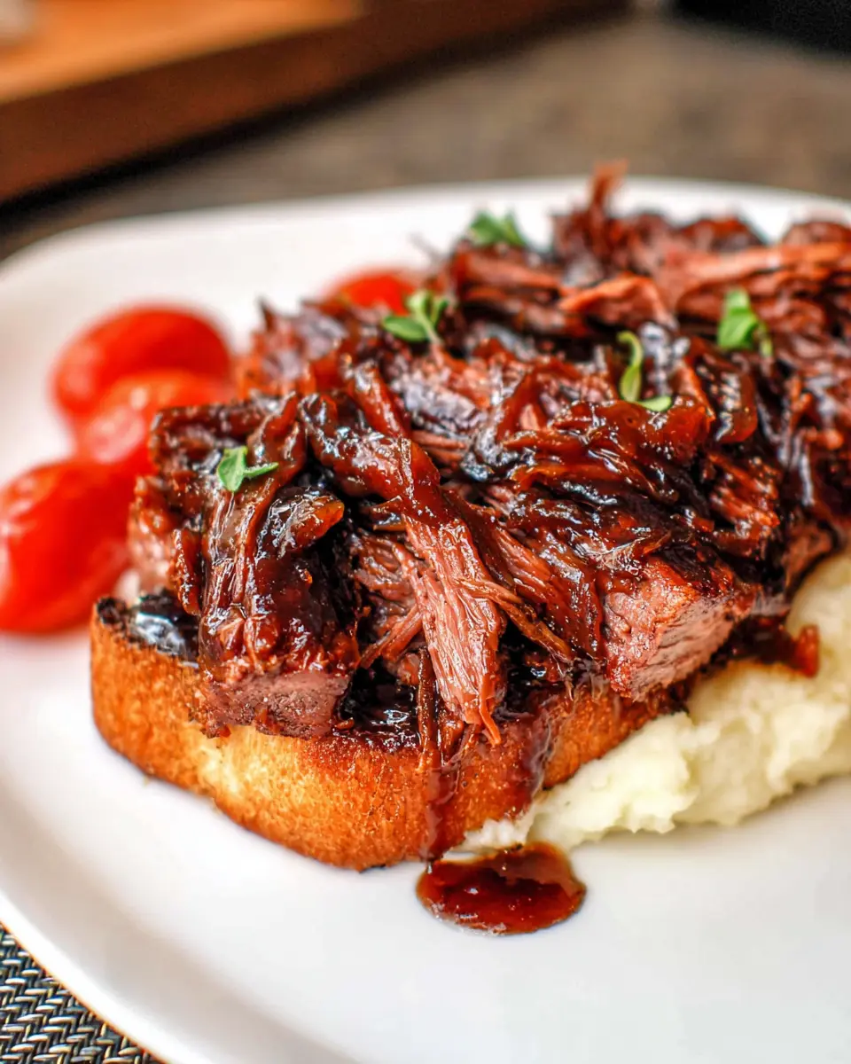 Now comes the fun part: assembling your Beef Manhattan. Start with a crispy piece of garlic toast on a plate as your base. Top it with a generous serving of creamy mashed potatoes, followed by heaps of the shredded beef. Don’t forget to drizzle a good amount of au jus sauce over the top. The combination of flavors and textures will have your guests raving about your cooking skills!