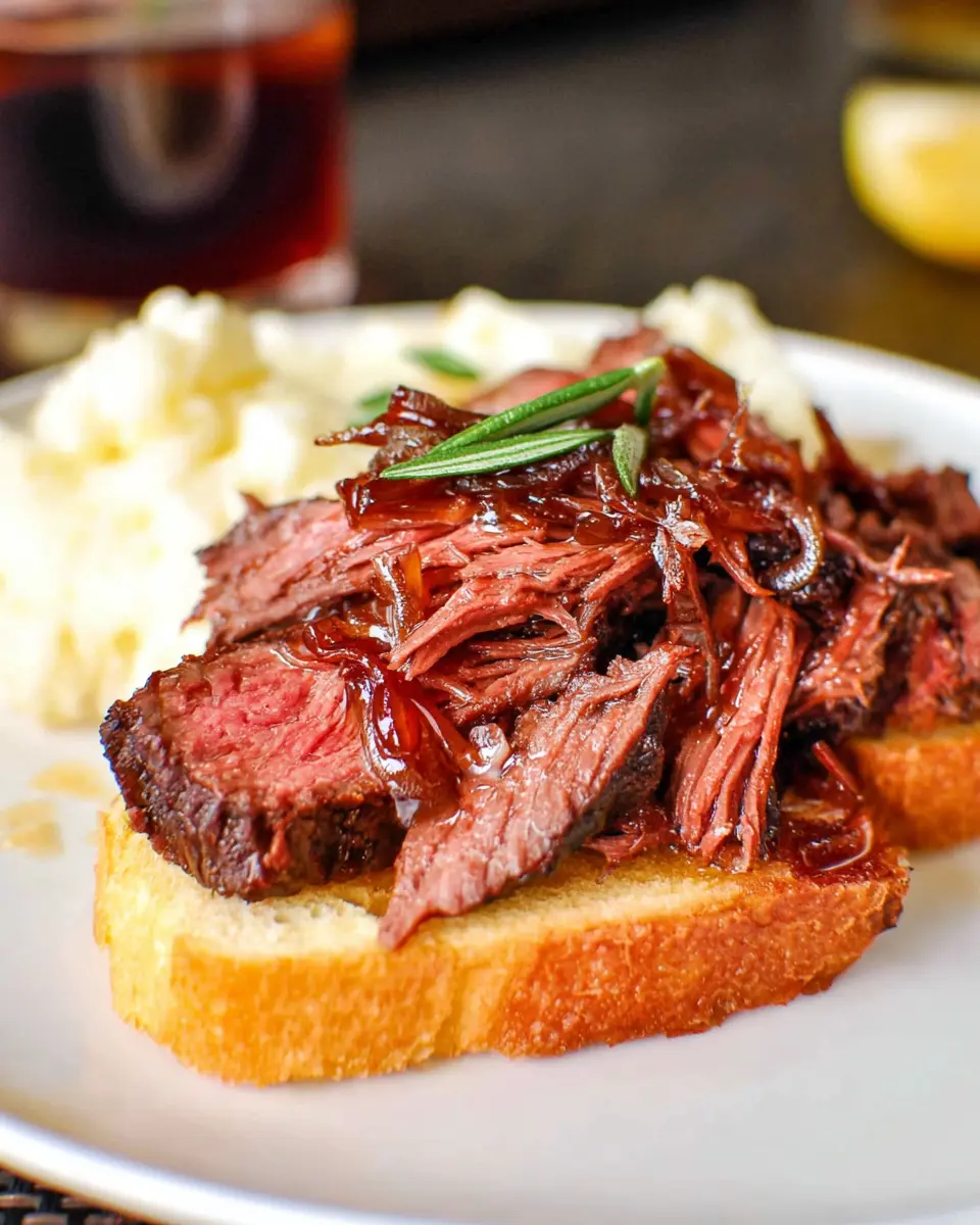 Serve with Style: For the classic presentation, serve your tender beef on garlic toast topped with creamy mashed potatoes and a generous pour of au jus.
