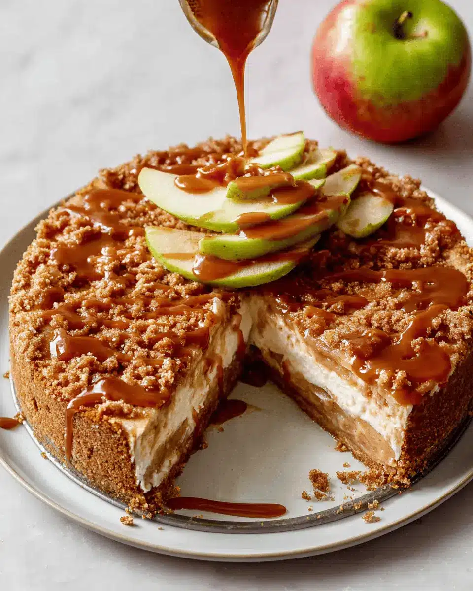 - Assemble the layers: Spread the cheesecake filling into the crust, then layer the apples on top. Drizzle salted caramel over the apples and sprinkle streusel topping evenly over.