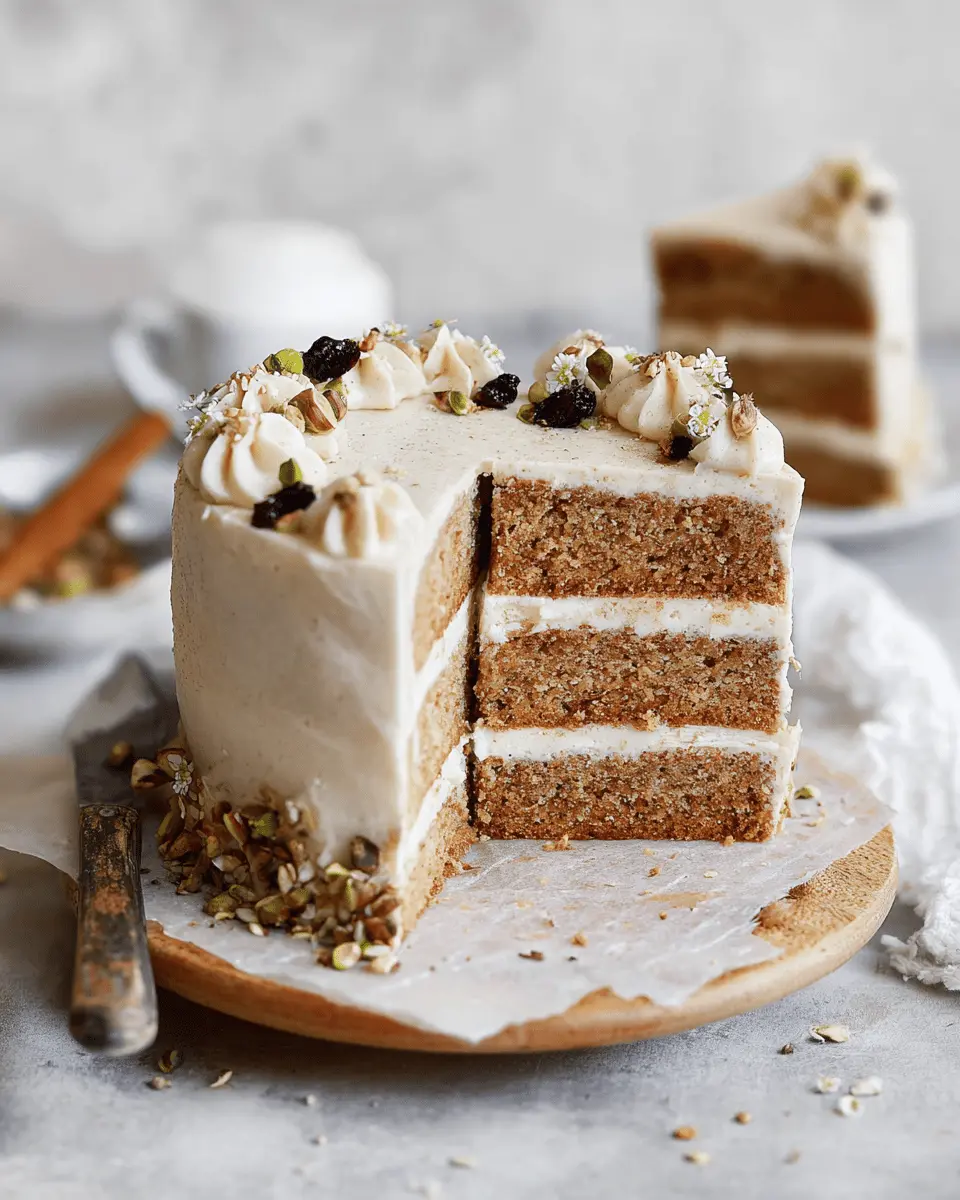 Take your first cake layer and place it on a serving plate. Add a generous dollop of frosting, then layer on the second cake, repeating the frosting step. Once your cakes are stacked, use the remaining frosting to cover the sides and top of your chai spice cake. Lastly, for a stunning finish, decorate with garnishes like blackberries, chopped pistachios, and even edible gold leaves for that wow factor!