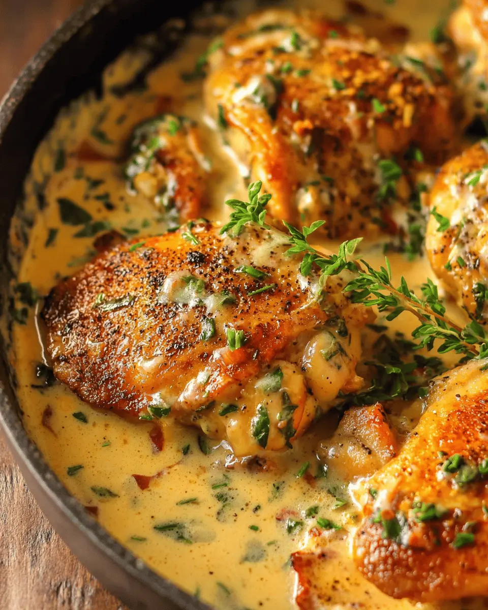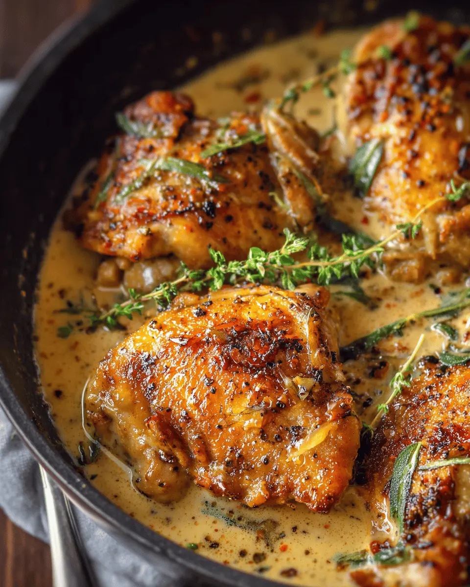 Carefully nestle your partially cooked chicken thighs back into the skillet, skin-side up. Make sure there's a little space between each piece to allow the sauce to seep in beautifully.