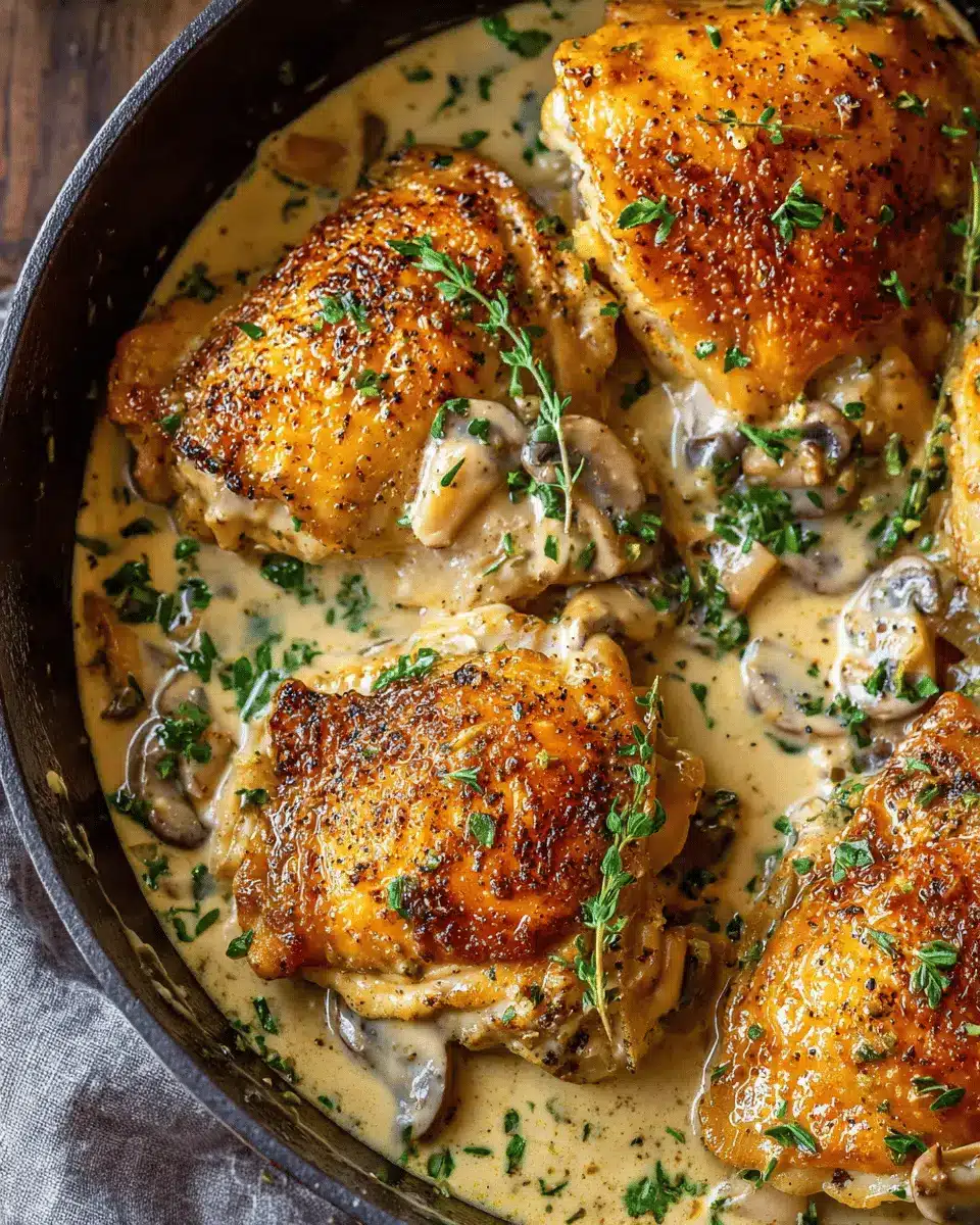 Once your skillet is ready, it’s time for that satisfying sizzle! Carefully place your chicken in the skillet, skin-side down. Sear them for about 5-6 minutes until the skin turns crispy and golden brown. Flip the thighs and cook for another 4 minutes. Once done, transfer them to a paper towel-lined plate, skin-side up, to rest while you prepare the sauce.
