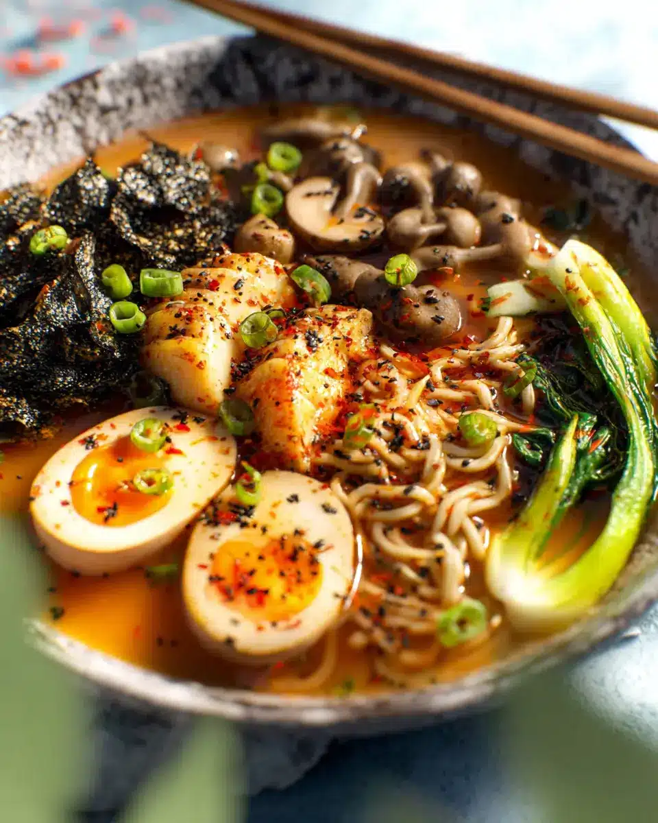 Finally, reintroduce the sautéed bok choy into the pot. Give everything a gentle stir to combine. Now it’s time to serve! Divide the cooked ramen among your bowls, ladle the steaming broth and dumplings over the noodles, and add a dazzling garnish of chopped green onions, crushed red pepper, and black sesame seeds.
