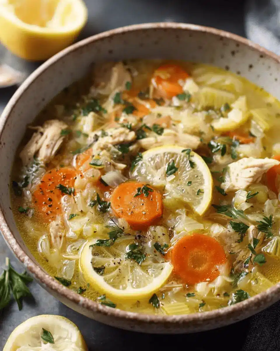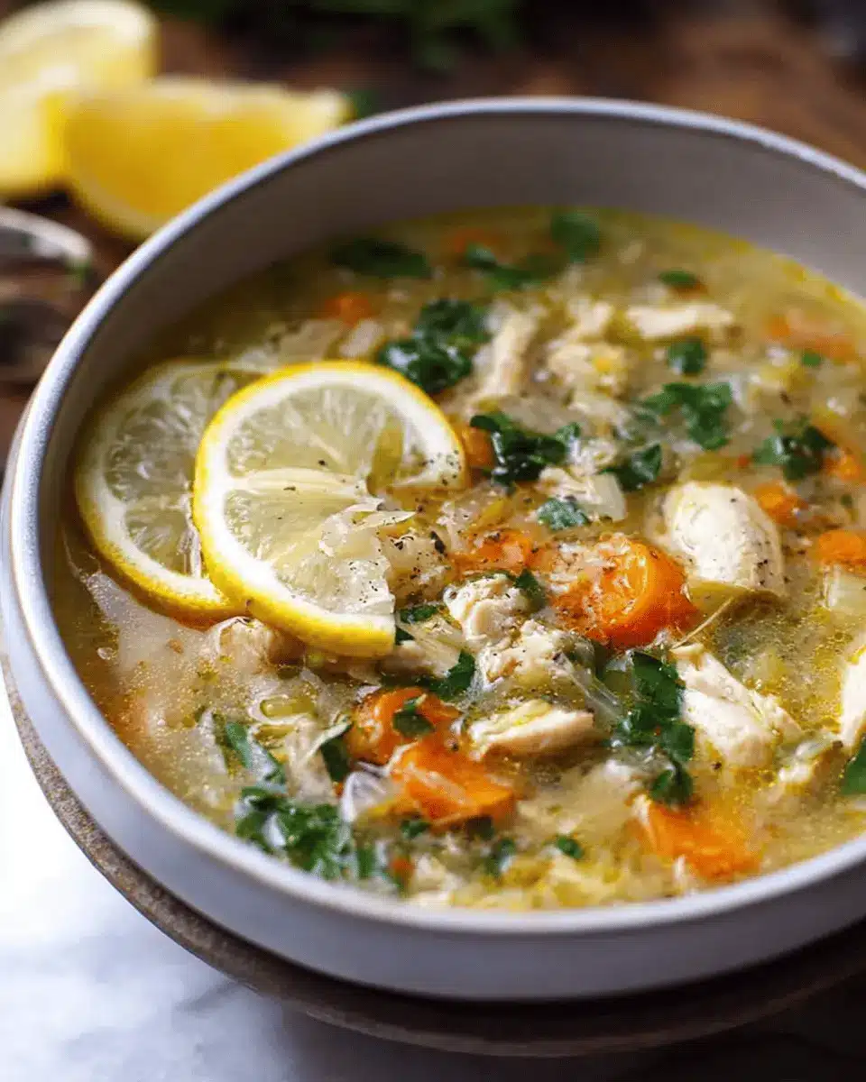 Plating your easy lemon chicken soup can turn a cozy meal into a delightful dining experience. Start by ladling the soup into shallow bowls, allowing the vibrant ingredients to shine. Sprinkle freshly chopped herbs like parsley or cilantro on top for a pop of color. Add a generous shaving of Parmesan cheese to create a rustic touch and place a lemon wedge on the side for an extra flair. For that final gourmet look, drizzle a little olive oil around the edges of the bowl—your guests will love it!
