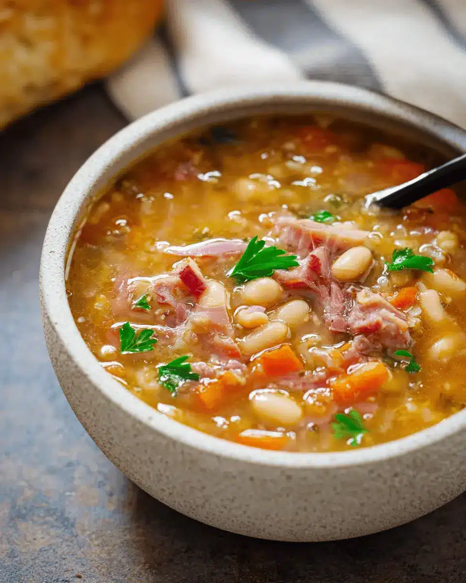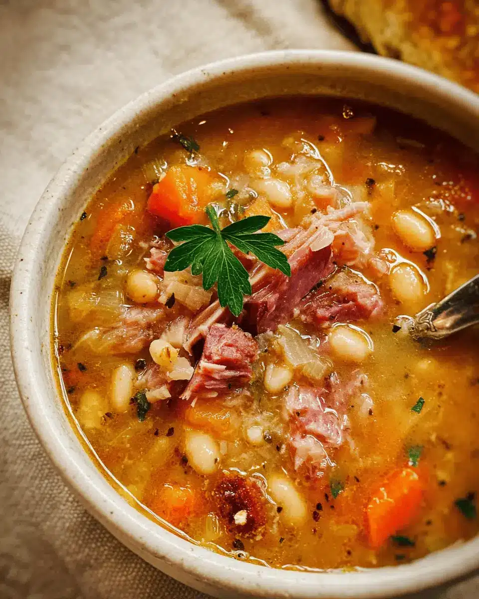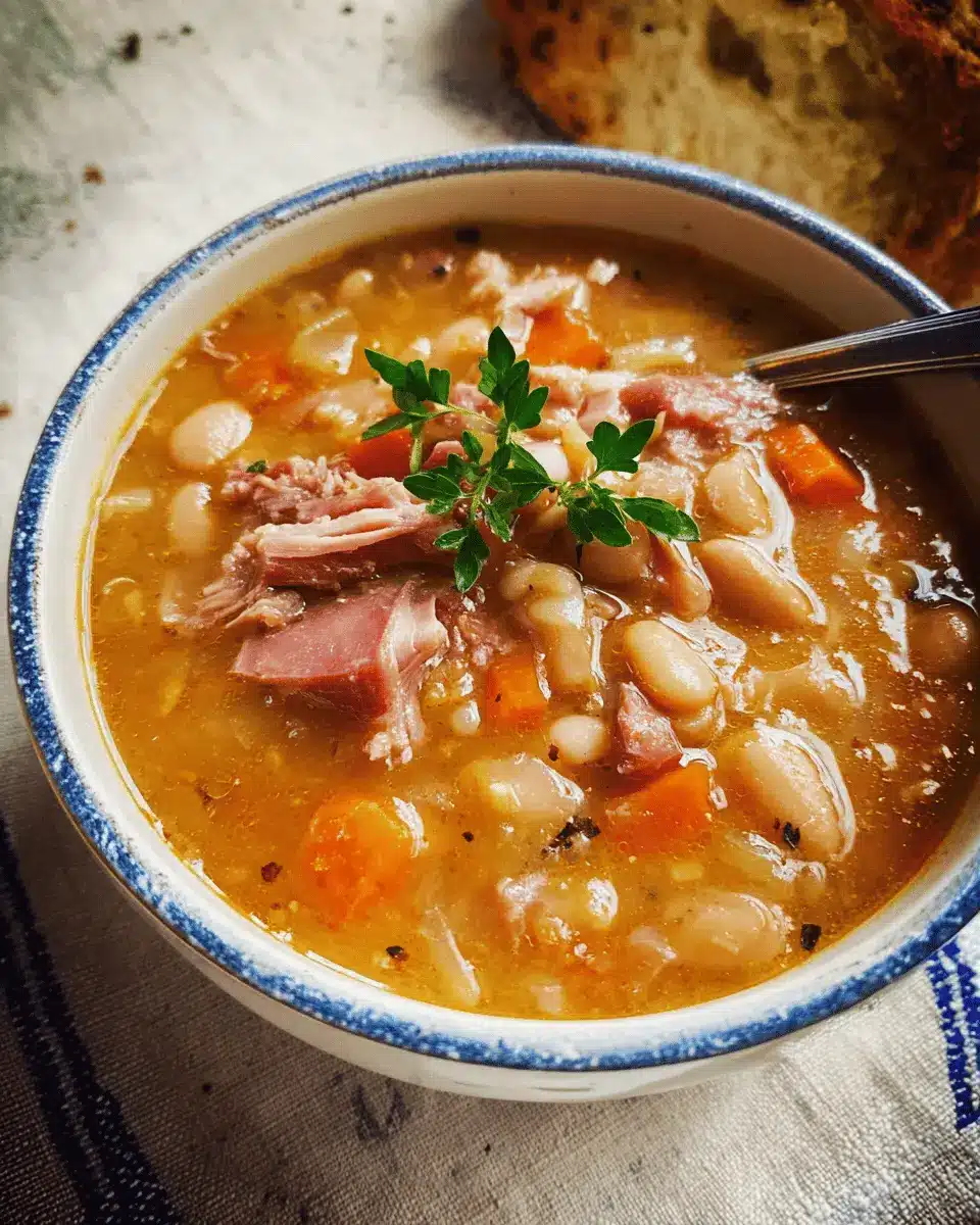 Easy Slow Cooker Ham Bone Bean Soup with Turkey Bacon and Chicken Ham