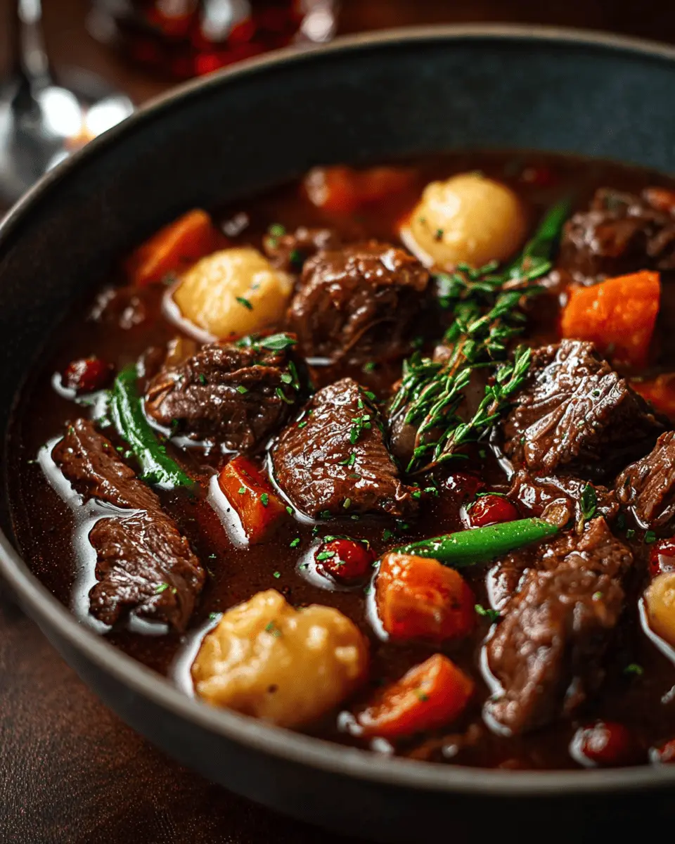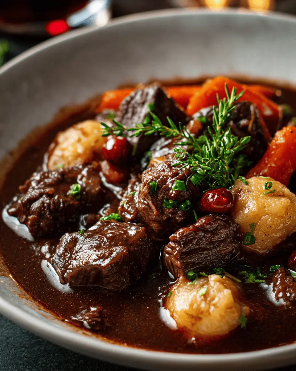 Serve the stew in individual cocottes for an elegant presentation at dinner parties. Adding a sprinkle of chopped parsley or fresh thyme before serving brightens the dish visually and enhances its aroma. For a delightful twist, try spooning the stew over fluffy polenta, offering a luxurious base that complements the beef's depth.