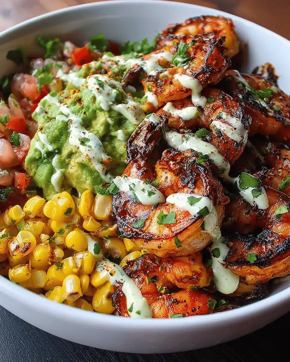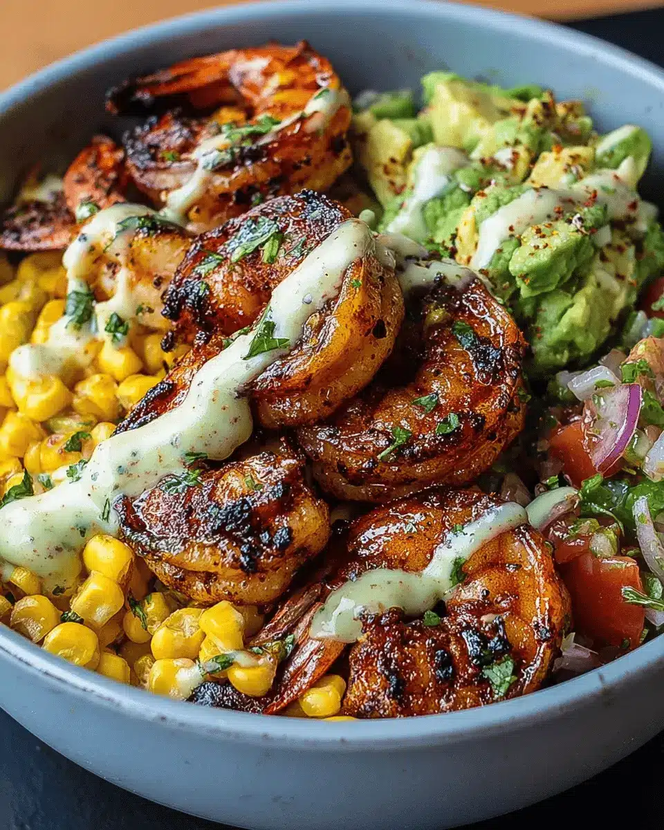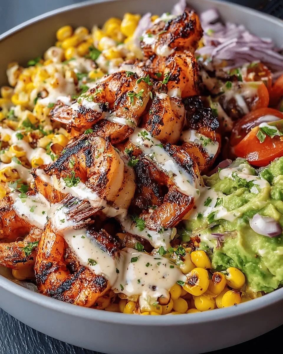 Grilled Shrimp Bowl with Avocado, Corn Salsa & Creamy Garlic Sauce