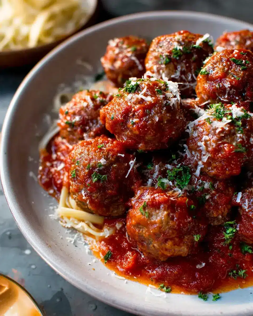 To serve your delicious Italian meatballs, place a generous portion of pasta on each plate and top with the meatballs and sauce. Don’t forget to garnish with extra Parmesan and finely chopped parsley for that Italian flair!