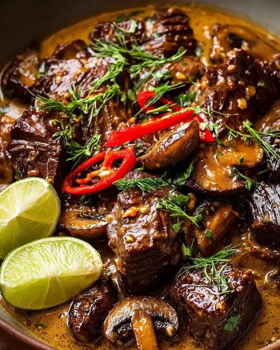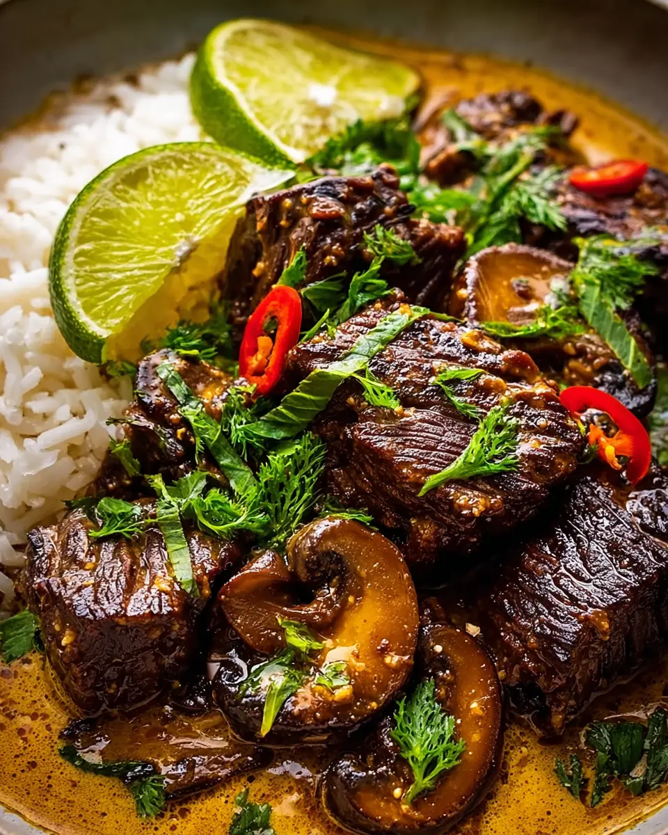 - Spoon the tender beef, mushrooms, and creamy coconut sauce over steamed rice. Garnish with fresh cilantro, lime juice, and chili oil or chili flakes.