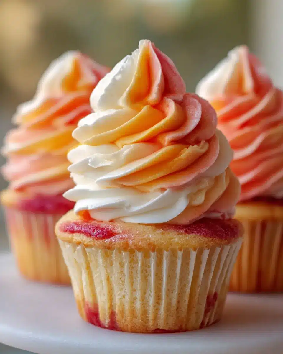 To achieve the stunning sunset swirl, place all three frostings side-by-side in a piping bag fitted with a decorative tip. Pipe the frosting onto each cupcake, creating beautiful, colorful swirls. For a finishing touch, add a slice of fresh strawberry or mango on top!