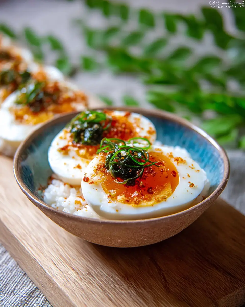 - To serve, place the egg over a bed of rice and garnish with green onion, seaweed flakes, and/or sesame oil to your preference.