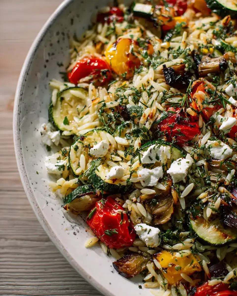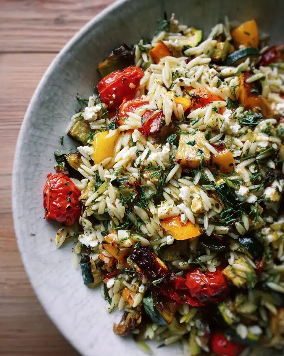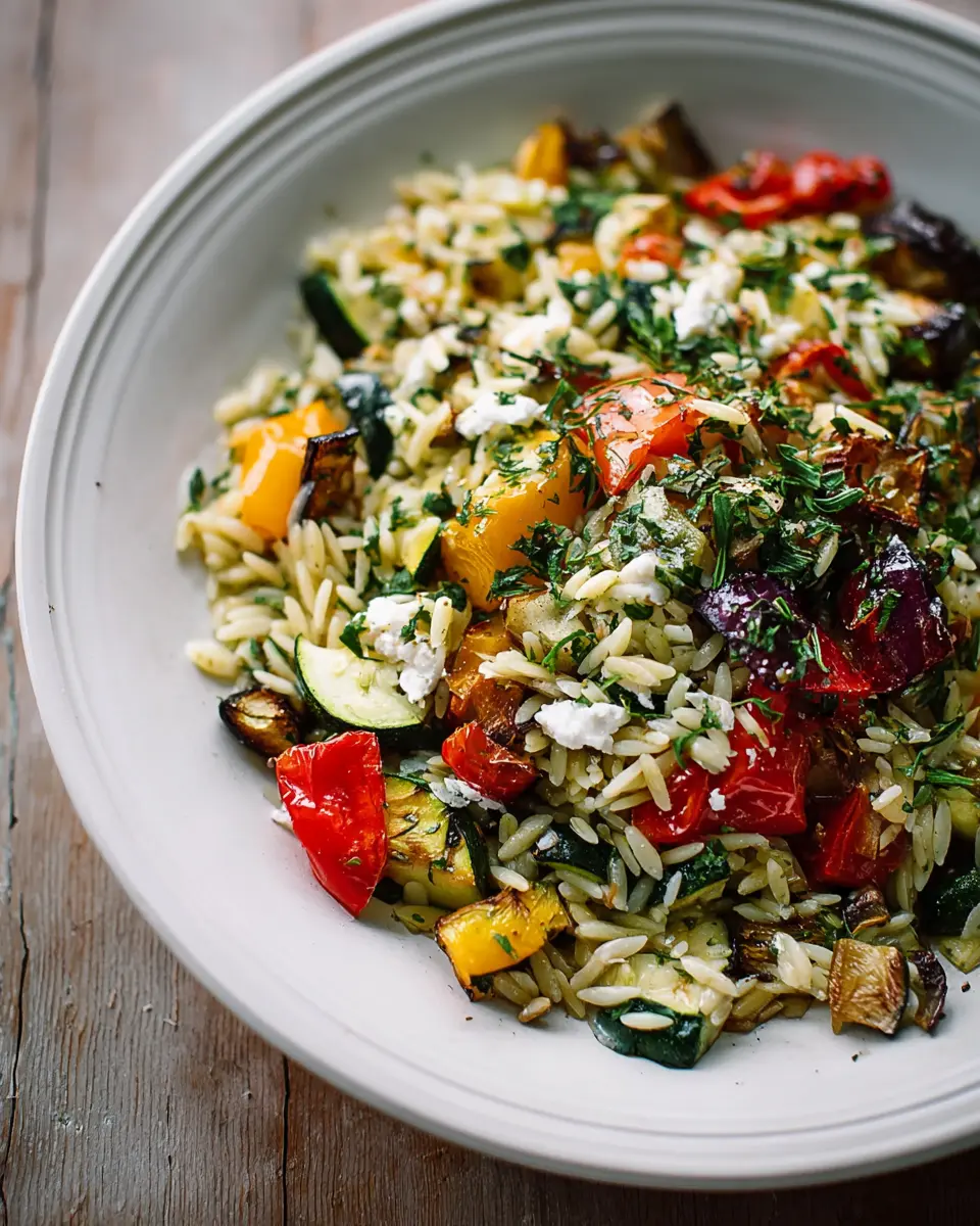 Transform your roasted vegetable orzo into a Mediterranean delight by adding traditional ingredients such as olives, sun-dried tomatoes, or artichoke hearts. You can also swap out the vegetables for seasonal favorites like roasted asparagus or Brussels sprouts. For an extra punch, sprinkle in some capers or serve with a drizzle of tzatziki. The beauty lies in the versatility—customize it to suit your palate or to use up leftovers.