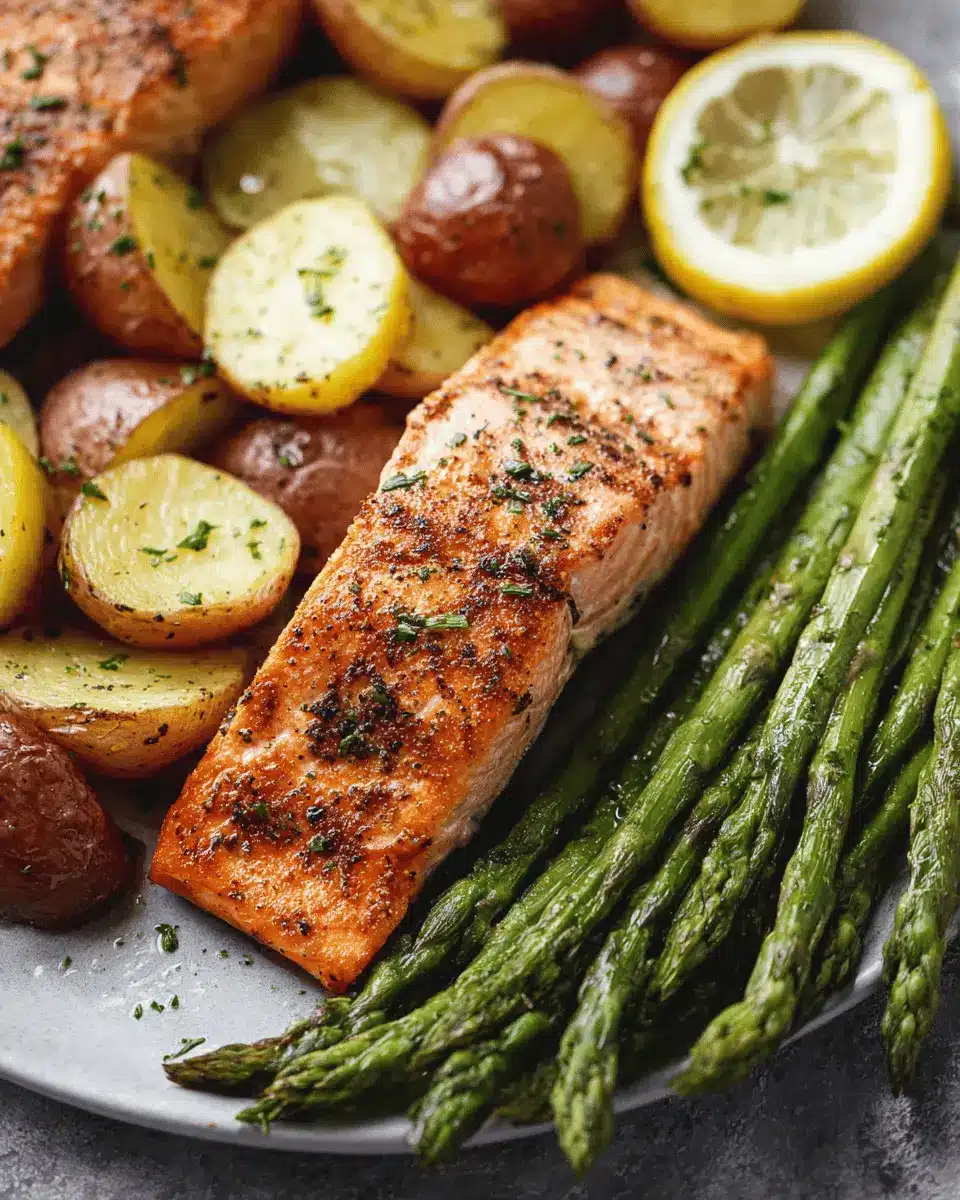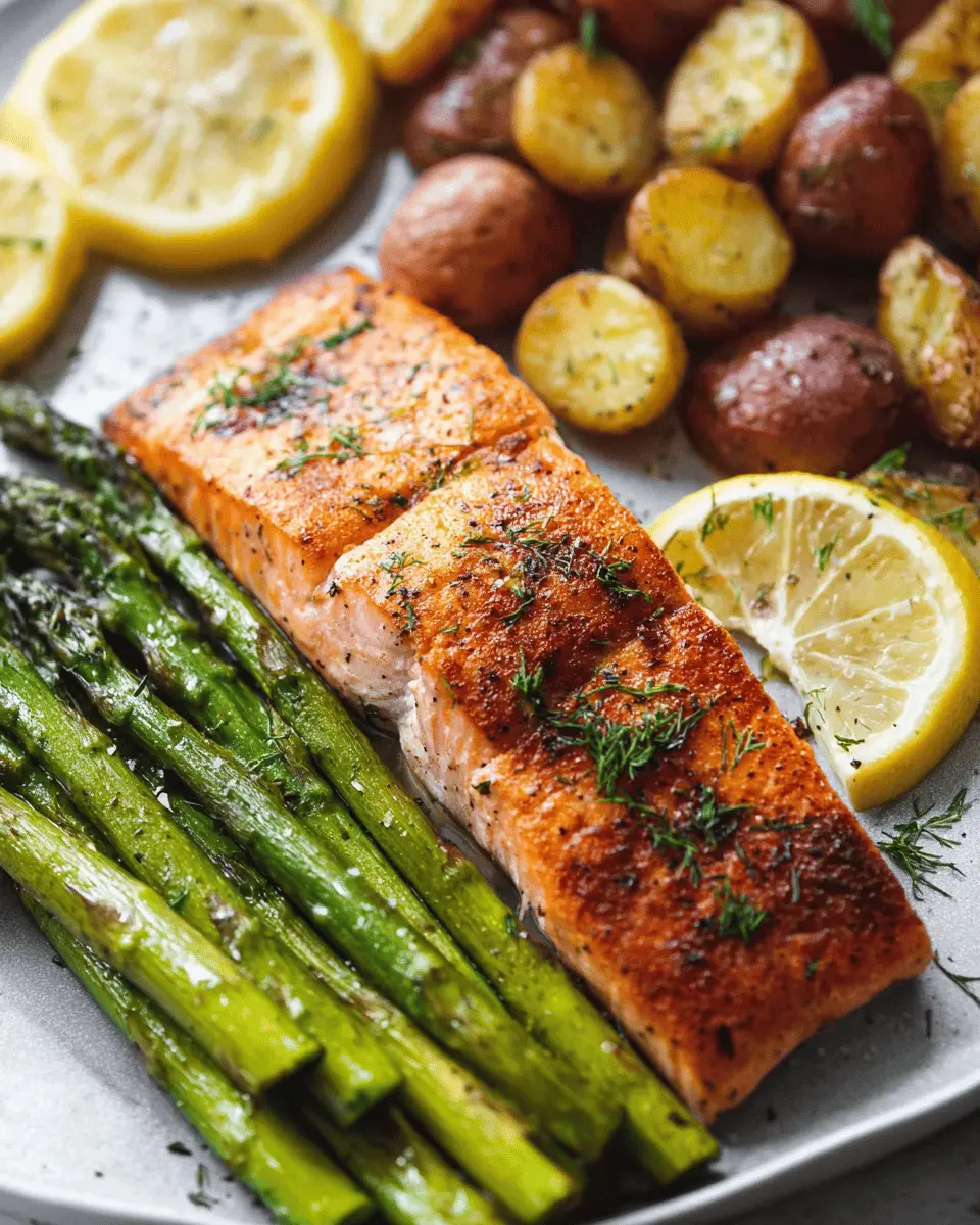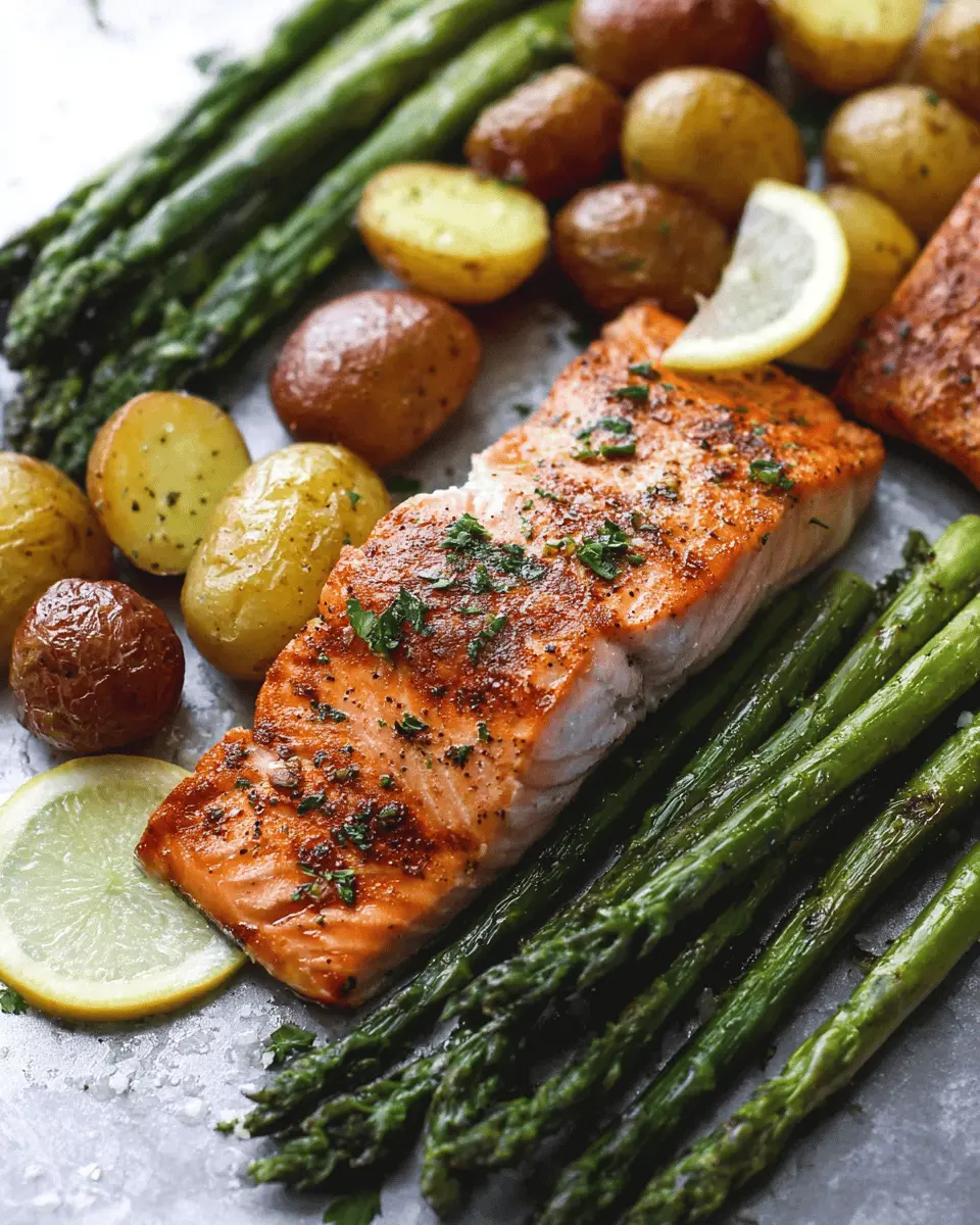 Cooking on a sheet pan means you can have a nutritious meal on the table in under 30 minutes. According to the American Heart Association, including fish like salmon in your diet can support heart health due to its rich omega-3 fatty acids. Plus, serving it with vibrant veggies like asparagus offers essential vitamins, while the baby potatoes give you that comforting texture without compromising on nutrition.