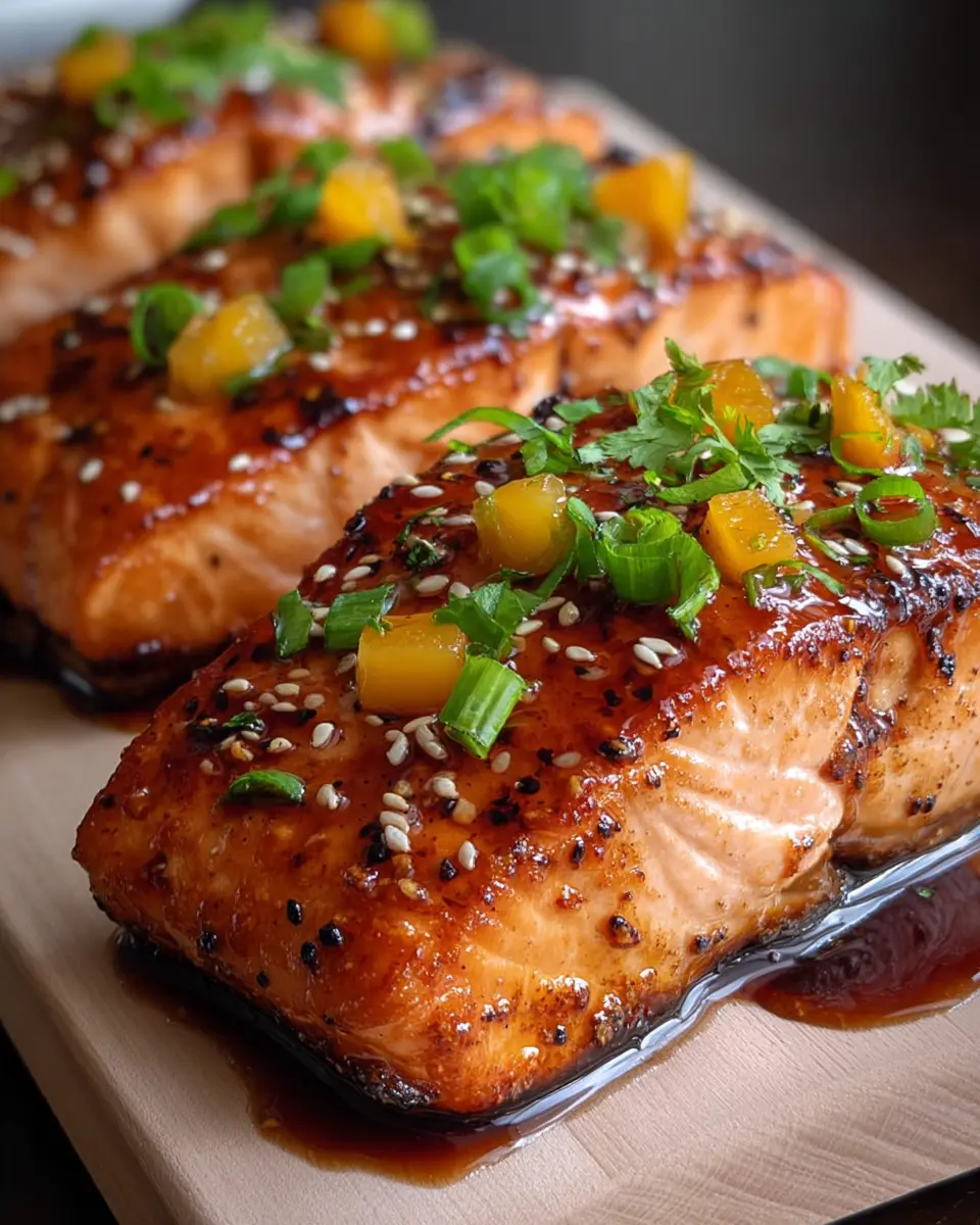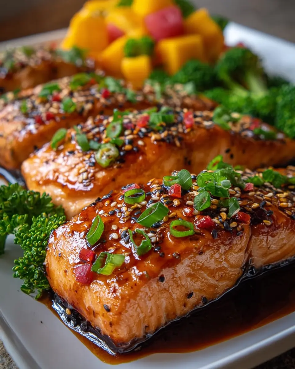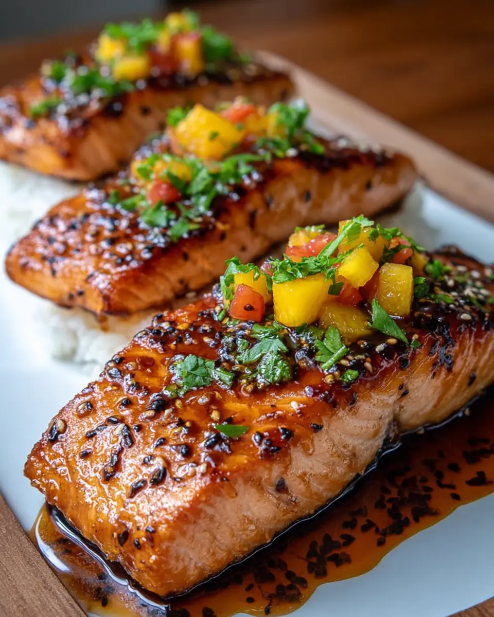 - Once the salmon is cooked, transfer the fillets to serving plates. Spoon a generous amount of the thickened teriyaki glaze over each piece of salmon. Top with the fresh mango salsa for a burst of sweetness and color.