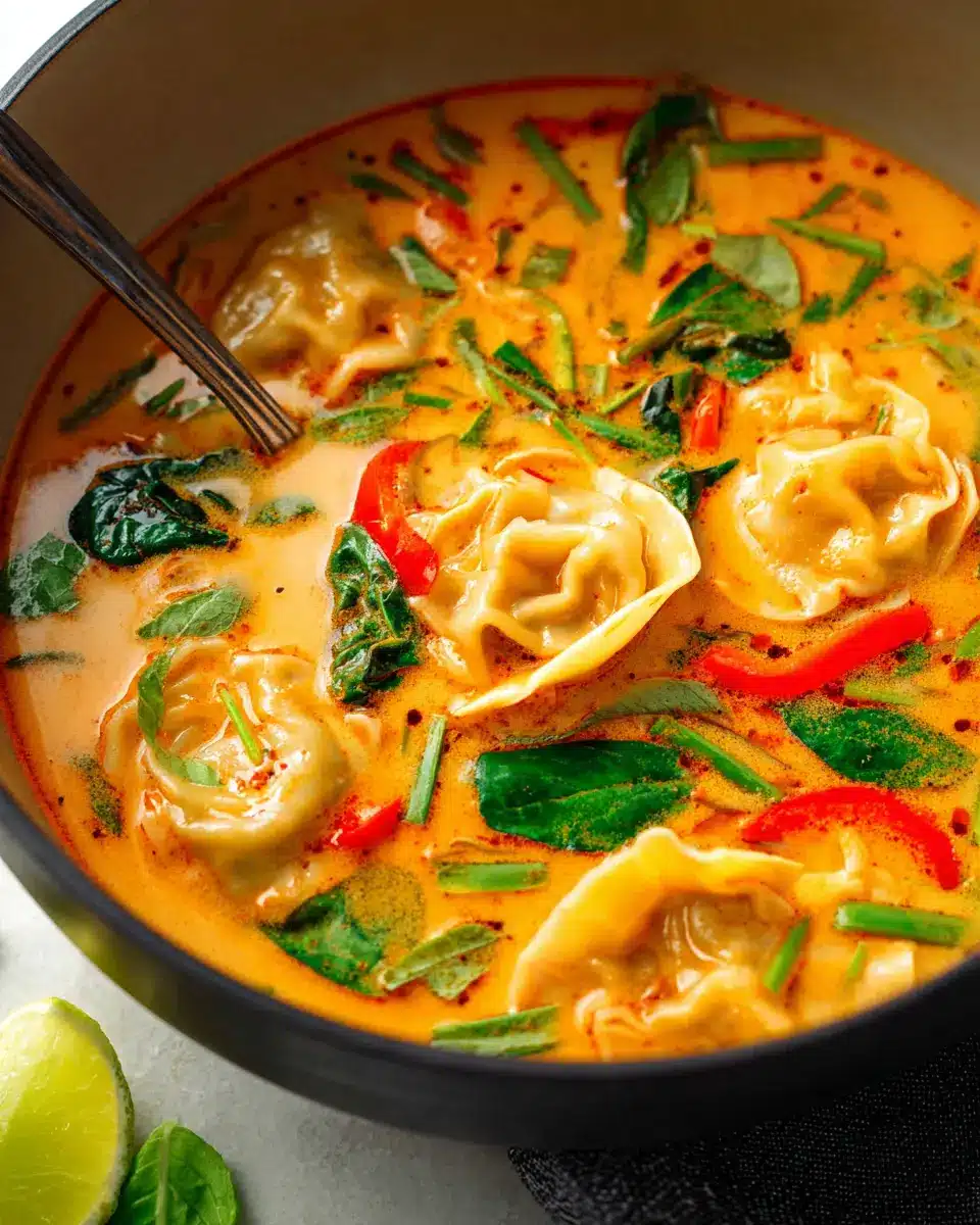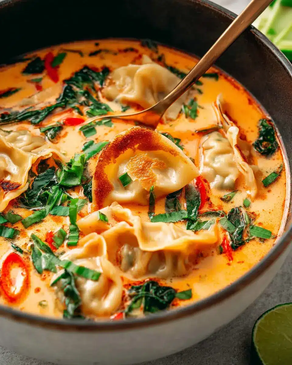 With your soup bubbling beautifully, add in the star of the dish—1 (1-pound) bag of frozen potstickers. These little pockets of joy will soak in all the flavors as they cook. Give them a gentle stir and let the soup do its job. After a few minutes, pour in 1 (15-ounce) can of full-fat coconut milk, then toss in a couple of handfuls of fresh baby spinach. Stir everything gently, allowing the spinach to wilt and the potstickers to become tender. This is where your Thai Red Curry Potsticker Soup starts to transform into a vibrant and hearty meal.