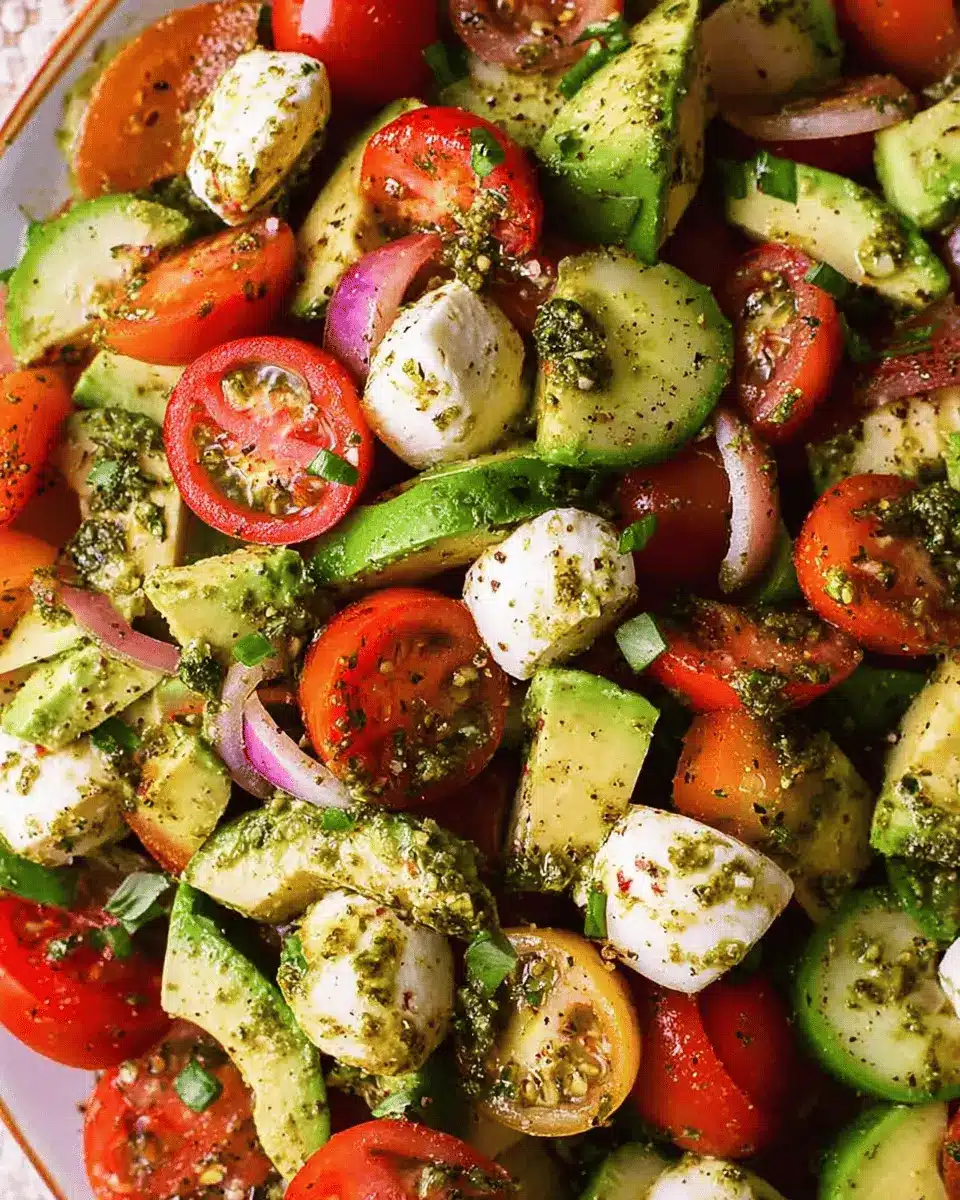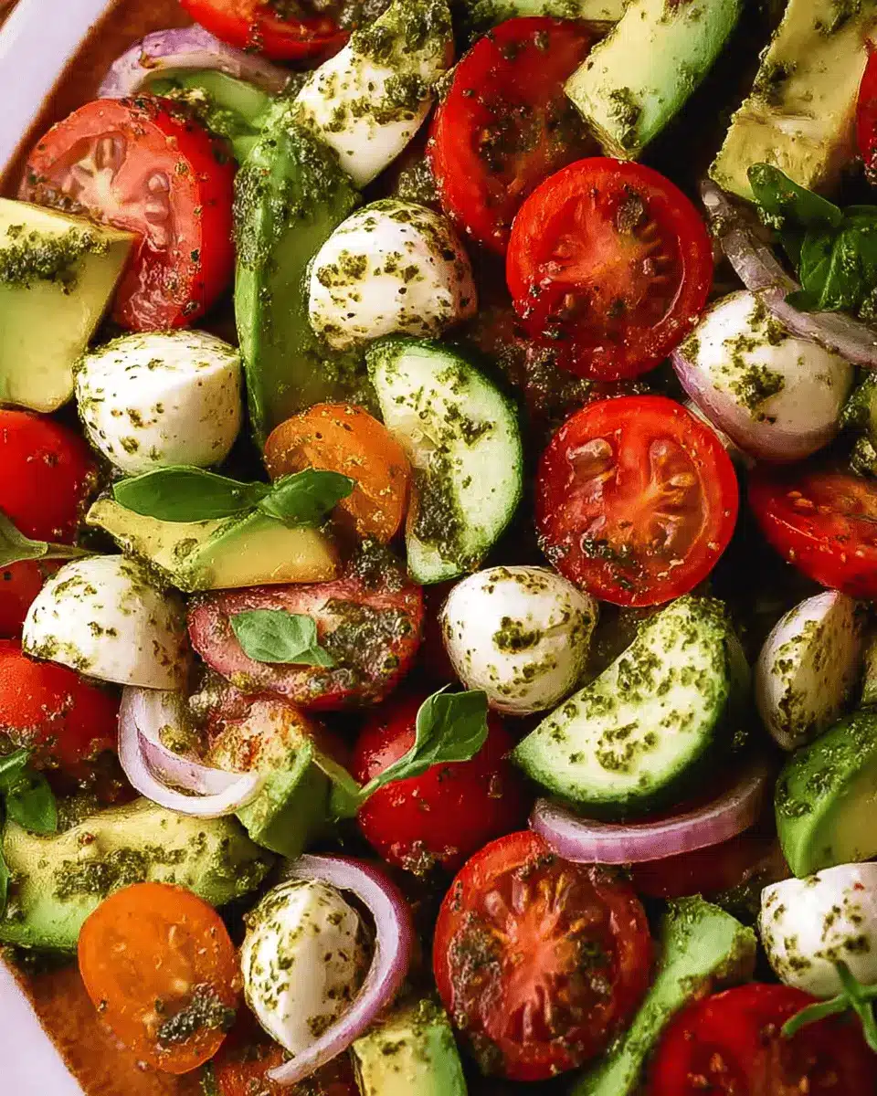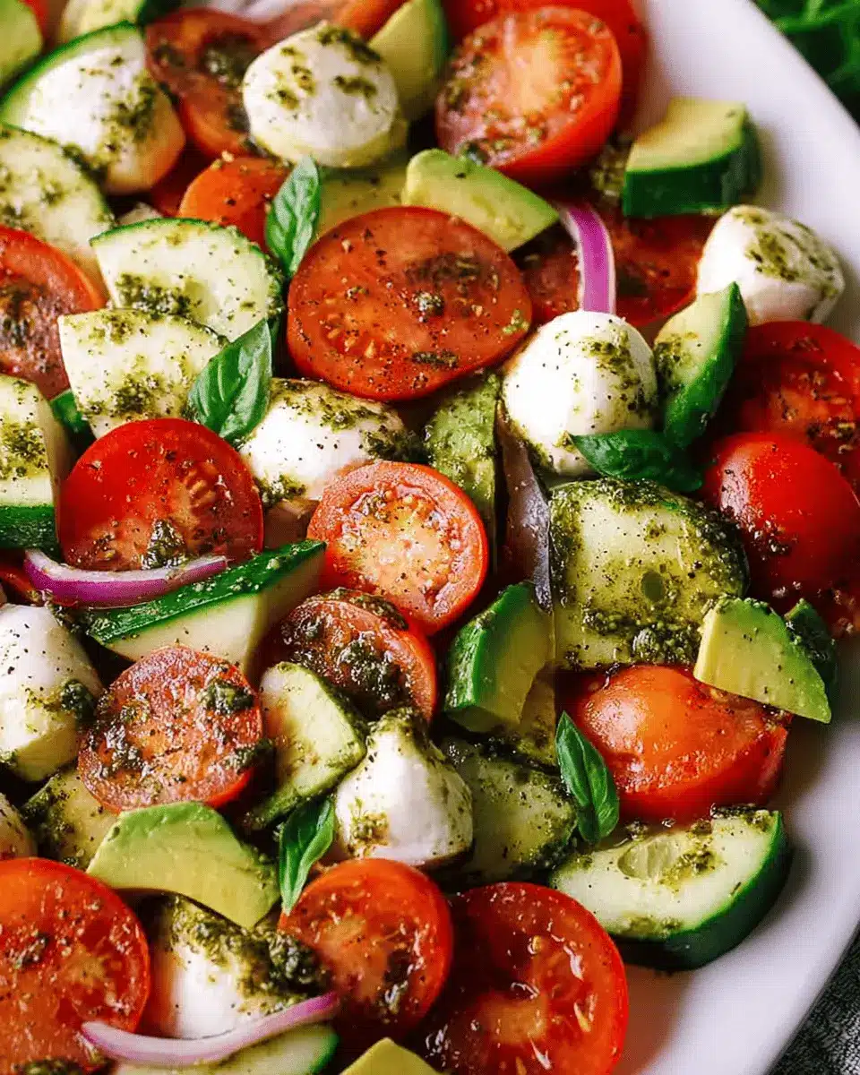 Tomato Cucumber Avocado Salad with Mozzarella and Basil Pesto